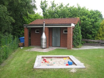 Im gemauerten Gerätehaus finden Sie für jedes Haus den gekennzeichneten Bollerwagen, manchmal auch Spiele für draußen.